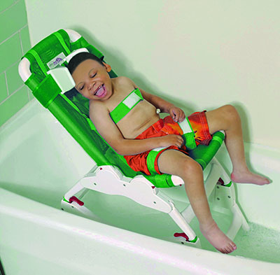 Designed for children with special needs or positioning issues, it is safe, comfortable, adjustable and ideal for children that need assistance while bathing. Suitable for the bath or shower, the chair is built to last with a sturdy plastic frame and vinyl covered nylon fabric. With a wide range of positioning options available, the Otter Bath Chair is the ultimate in comfort and security. Easy to use and versatile as both the seat and back can be adjusted with only one hand with the child in the chair. Both offer five progressive angle adjustments of 0 degrees, 22.5 degrees, 45 degrees, 67.5 degrees and 90 degrees. The head cushions, which can also be used for lateral support, are height and width adjustable. The leg straps help control abduction and adduction and the slip resistant legs raise the chair up to 7″. Soon to be a favorite place for your child to sit because it’s so comfortable, it’s convenience will be welcomed when you’re using this chair in places other than the bath. This Otter Bath Chair is sized Small with an overall length of 36.5″. Please note, a child should never be left unattended while the bath chair is in use. No assembly required. Open the box, unfold the chair, adjust the seat, back and legs for the child and safe bathing can begin. The Bath Chair has a weight capacity of 60 lbs. The positioning straps can be inserted into any of the loops along the length of the chair for optimal comfort and security. Weighing only 11 lbs., The chair is easy to maneuver and because it folds flat, storage is a breeze too. To clean, first secure the hook and loop fasteners. Wash the chair and fabric with soap and water. Fabric and straps may be removed and machine-washed.