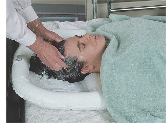 At shampoo time remove pillow and replace with the crescent-shaped basin; no repositioning is necessary large drain tube for emptying; inflatable plastic basin.